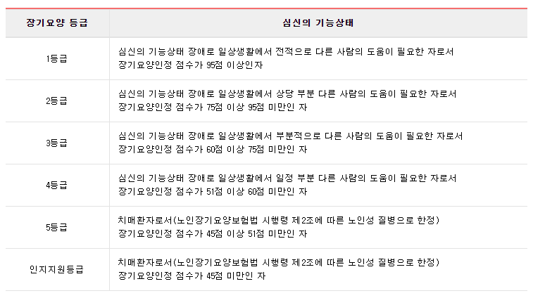 등급판정은 건강이 매우 안좋다, 큰병에 걸렸다 등과 같은 주관적 개념이 아닌 심신의 기능상태에 따라 일상생활에서 도움(장기요양)이 얼머나 필요한가?를 지표화한 장기요양인정점수를 기준으로 합니다. 장기요양인정점수를 기준을 다음과 같은 6개 등급으로 등급판정을 합니다.