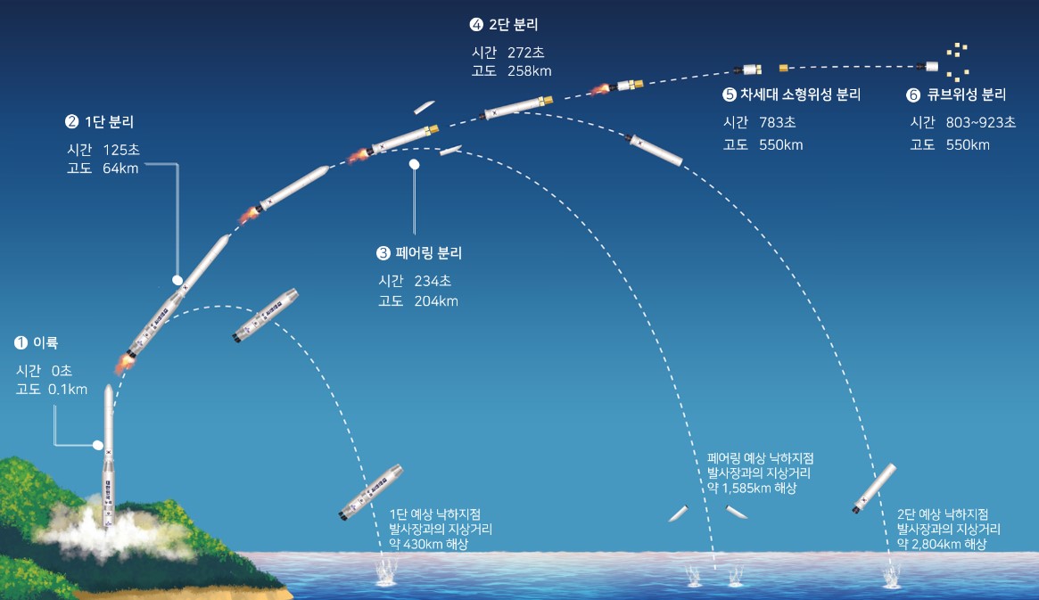 ※ 누리호 1차 발사에서는 위성모사체 발사, 2차 발사에서는 위성모사체와 성능검증위성(큐브위성 4기)을 발사(독자 개발한 한국형 발사체를 통해 위성을 최초로 탑재하여 발사)